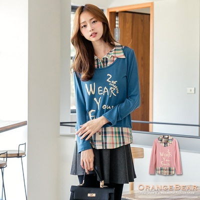 [分享推薦]微甜學院~英文燙印圖案拼接格紋有領假兩件上衣.2色