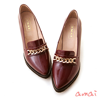 服務這麼優,當然在網路購物最好啦~~你一定要來看看【amai】金屬鍊飾尖頭樂福粗跟鞋.漆皮素面(醇酒紅)~~