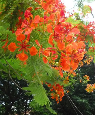 《六月 鳳凰花開》 奔放蔓燒吧! 火鳳凰 連同畢業的淚水 一齊 預告盛夏即將來臨 綠絨堅守 冉冉靜碧 再多一點六月的風 點燃的便不止是熱情 還有戀蝶幽幽糾纏的 聆聽
