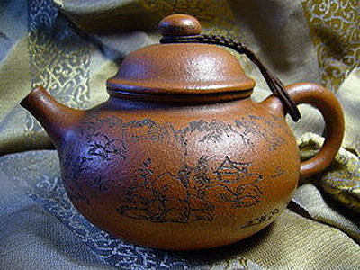 全壼彫刻山水~連壁圖壺蓋上‘竹節橋鈕’製作手法非常細膩*外粉飾層~湯淋朱泥