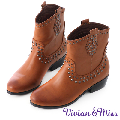 Vivian&miss 街頭嬉皮~顯瘦百搭鉚釘西部短靴(棕) 威力彩