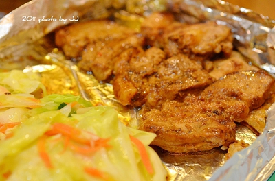 結果咧,隔了兩天,多吉爸喜滋滋地回了一盤高麗菜烤肉排,