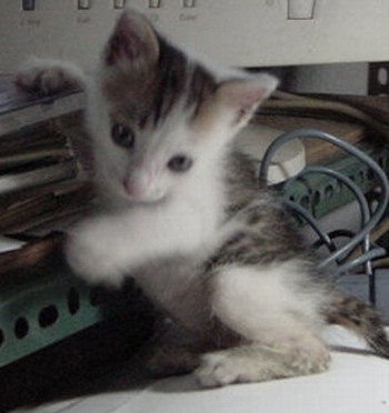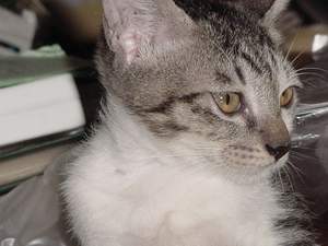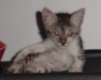 很Q的短尾小喵喵"比比"領養 一隻QQ白底虎斑小喵喵開放領養,男生,約兩週大來到我家.好不容易過完餵奶的生涯,已經會吃罐頭及乾飼料.為白底雜著虎斑貓咪清楚的紋路,個性開放大方頑皮,對誰都不怕生,約1...