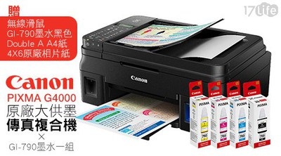 最近在購物網上看到Canon-PIXMA G4000原廠大供墨傳真複合機+GI-790墨水1組+贈GI-790黑色墨水1入+Double A(A4紙500張)2包+4X6原廠相片紙1包+無線滑鼠1入" ,