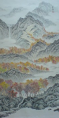 天涼好個秋畫的稿本是澄清湖邊傳習齋前的水畔風光。傳習齋前有數株大花紫薇,每到秋冬之際,樹葉就漸次轉紅,而且紅得很有層次。商人把實際的景色作了一些調整,不過明眼人應該還是可以認得出來。將實際的景物隨心變...