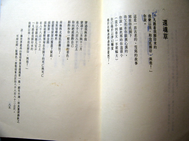 還魂草,這可真是詩集中的夢幻逸品,而且你還一次擁有兩個版本,只能說羨慕了,像我要找一本,幾年了也從沒看過,而一些圖書館縱使有,也列為不外借圖書。真佩服你找二手書的毅力,當然還有好運氣囉!