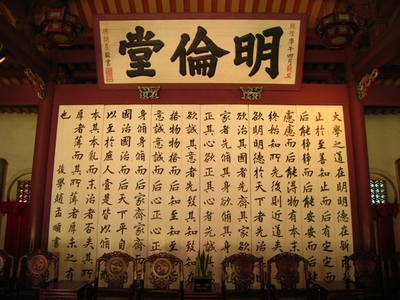 明倫堂內有一整面牆的「大學」之文,書體是仿元代書法家趙孟頫的字,從一入口的「入德」到「明倫」,以及牆上的「大學」,顯示儒學為宗的學風
