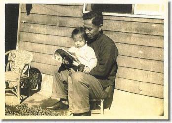 跟著一張黑白照片畫出來的:當時我才兩歲。院子裡,父親抱著我在膝上念書(兒童樂園?),旁邊有一張小小的藤椅,是孩子用的藤椅,我專用的座位吧,而記憶裡,是有那樣一張藤椅,用藤條千迴百繞,破了又補,補了又破,直到我大了坐不進去那張藤椅。