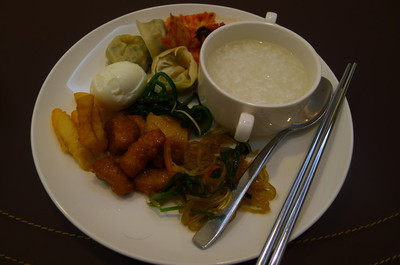 不知怎麼,第3日早上,竟沒什麼胃口。於是泡了杯熱茶,隨意夾拿了一點菜。最後,再吃一小碗白粥加蔥末、蒜酥,暖暖胃...