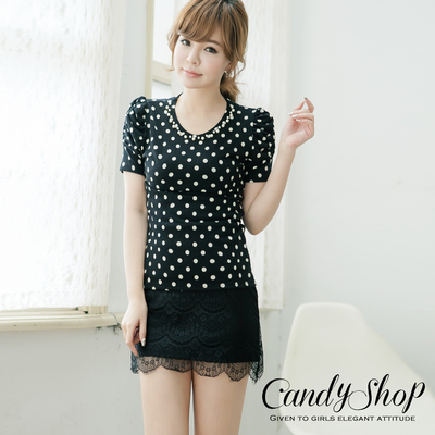 CANDY小舖 珍珠圓領皺皺袖圓點點韓國上衣(黑色)