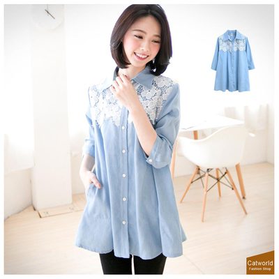 Catworld 側口袋花型布蕾絲傘狀襯衫共淺藍色