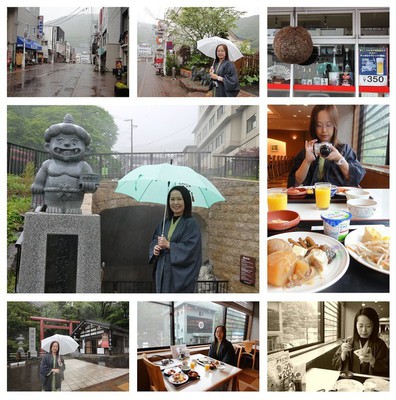 昨晚沒有機會穿浴衣到街上拍照,於是隔天我們比預計時間還要早了一個小時起床,沒吃早餐,就先著浴衣冒雨上溫泉街拍照去。