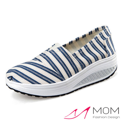 【MOM】歐美流行款雙色條紋印花透氣帆布懶人休閒搖搖鞋 健走鞋(藍)