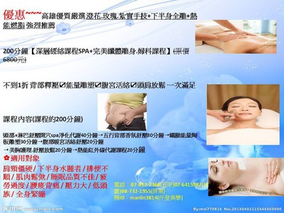 感受.從頭.身體.腿.到腳趾.如同脫胎換骨..淨化自由基造成體質汚染.補充養份改善身體.失珉.現代的憂鬱症.夏季養生SPA護理….結合中西療法.由外而內側底調理身心…生機最...