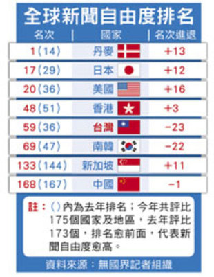 原文出處: 壹蘋果日報政府干預 我新聞自由掉23名2009年10月21日蘋果日報【劉永祥、王烱華╱台北報導】「...