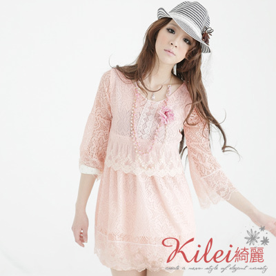 專櫃初體驗勾織洞花蕾絲七分袖長上衣(浪漫粉)-Kilei綺麗之非常顯瘦穿搭技巧教學