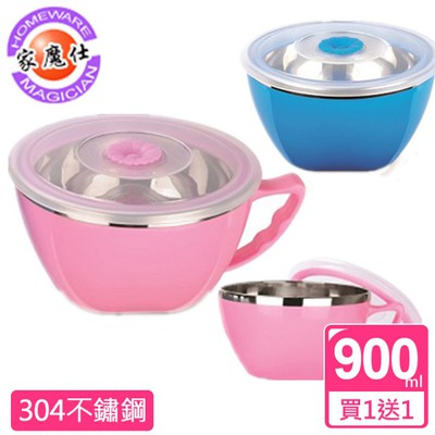 【家魔仕】多用途不鏽鋼#304超大炫彩隔熱碗 2入(900ml)HM-1368(粉紅色)