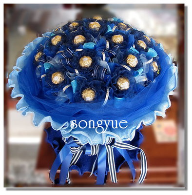 商品訊息功能: 金莎配上鮮明的藍色包裝凡人無法擋 送給親愛的人 精緻緞帶裝飾 魅力十足會站立的花束喔