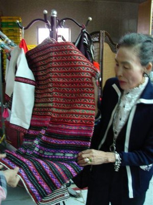 這是內部的樣子,阿嬤就坐在這裡告訴我們:很久以前她媽媽坐在這裡,爸爸坐在那裡,點著火,半夜三點的時候媽媽教她如何織布,上頭的這些圖案就是他們生活周遭的點點滴滴......
