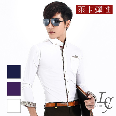 L AME CHIC 韓國製經典英倫金鑽釦素面萊卡窄版長袖襯衫