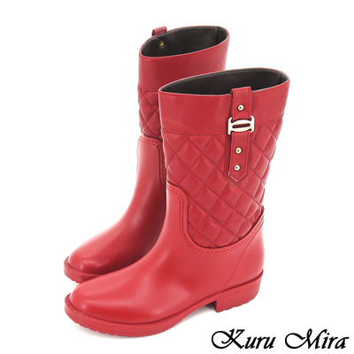 Kuru Mira雨靴-鉚釘金釦菱格紋拼接中筒防水雨靴-紅