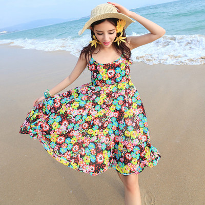 吊帶露背波西米亞高腰碎花雪紡沙灘洋裝(紫色)-Joli-neon商品網址: