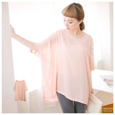 Catworld 肩綴布蕾絲前短後長雪紡衫共粉色