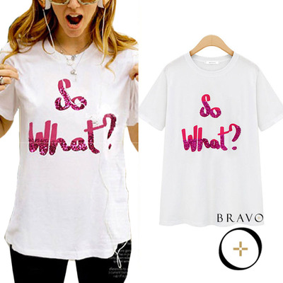 我覺得塗鴉亮片字母純棉白色T恤 Bravo不僅穿起來合身舒適,自己感覺也變很有時尚的FU!!(哈哈哈!!!!)