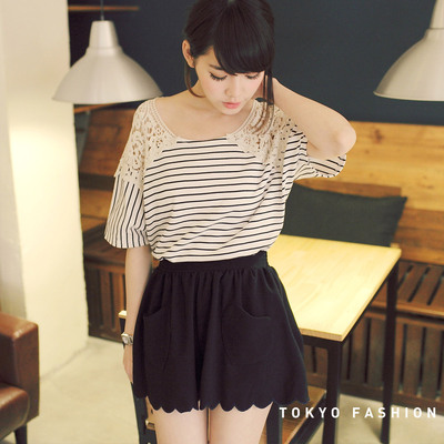 東京著衣 小透膚鉤花拼接條紋T(共一色)