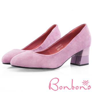 【Bonbons】法式優雅女伶系列圓頭真羊麂皮拼接小粗跟鞋100046(羅蘭粉)