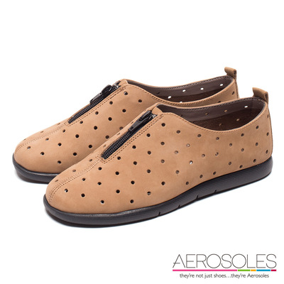 AEROSOLES 超輕系列 舒適樂活真皮圓形透氣鏤空拉鍊飾休閒鞋~蜜糖杏