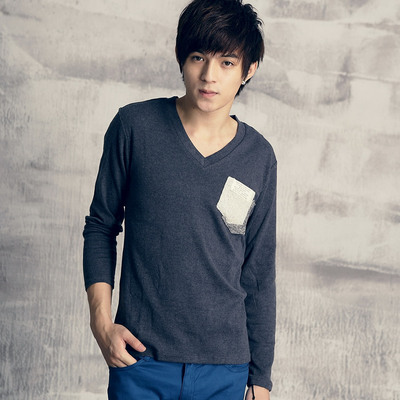 小猴子的賣場 韓版素面棉麻拼接口袋V領長袖T恤-三色