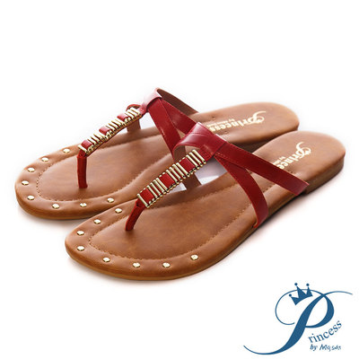 Princess - 牛皮金屬裝飾T型夾腳涼鞋- 街頭紅