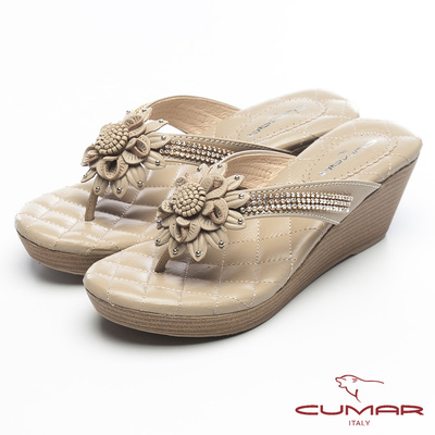 CUMAR優雅典範 立體花楔形跟涼鞋-米色
