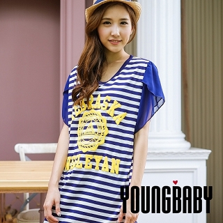 【YOUNGBABY中大碼】韓國直運 三角logo雪紡花苞袖條紋長T(共2色)