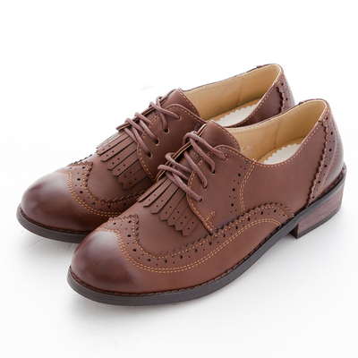 River&Moon英倫經典擦色雕花流蘇繫帶牛津鞋-品味咖
