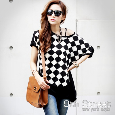 9th Street 圓領格紋拼接長版上衣(共二色)