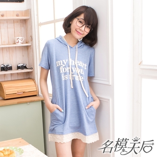 【名模天后中大碼】雙口袋拼接蕾絲造型連帽洋裝(藍)