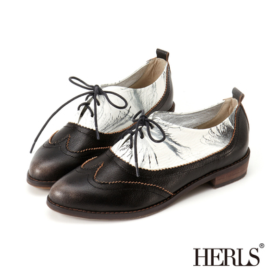 HERLS-潑墨擦色 真皮綁帶牛津鞋-黑色