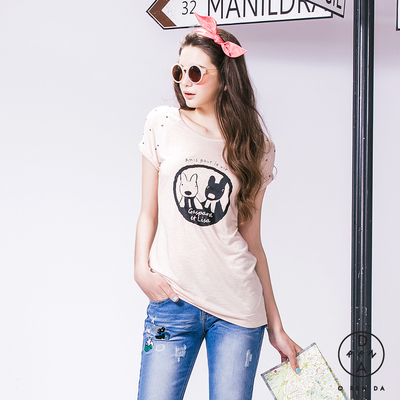 ORENDA-G&L鉚釘印花反摺袖上衣-S.M.L-粉橘