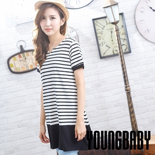 【YOUNGBABY中大碼】正韓 小v領配色條紋下裙洋裝(共2色)