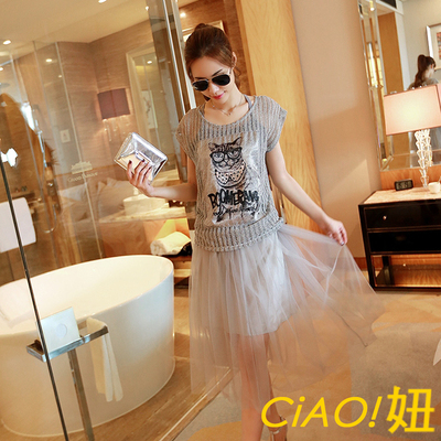 縷空繫帶貓咪拼布二件式上衣 (灰色)-CiAO妞