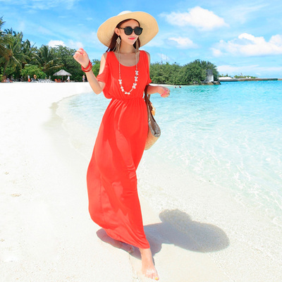 波西米亞寬鬆顯瘦中高腰套頭長洋裝(橘紅色)-Joli-neon商品網址: