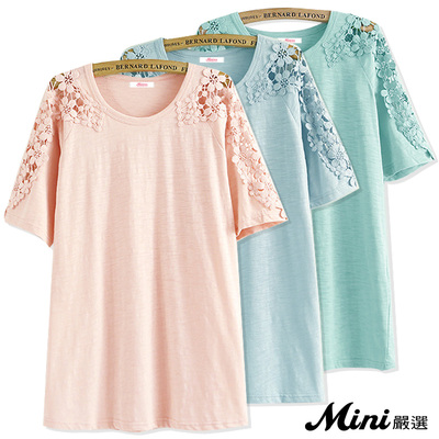 上衣 竹節棉肩部鏤空蕾絲短袖上衣 三色-Mini嚴選