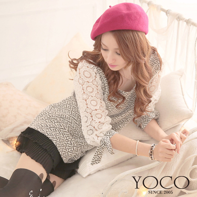 東京著衣-YOCO 花紋拼接蕾絲袖毛織上衣-S.M(共二色)