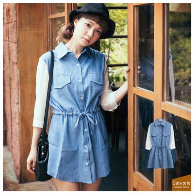我覺得牛仔拼接雪紡抽繩襯衫中藍色Catworld不僅穿起來合身舒適,自己感覺也變很有時尚的FU!!(哈哈哈!!!!)