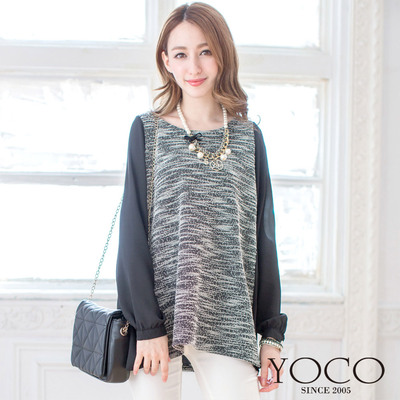 東京著衣-YOCO 雪紡袖拼接混色毛織上衣-S.M(共二色)