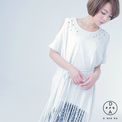 ORENDA-鉚釘流蘇挖肩長上衣-S.M-淺麻灰