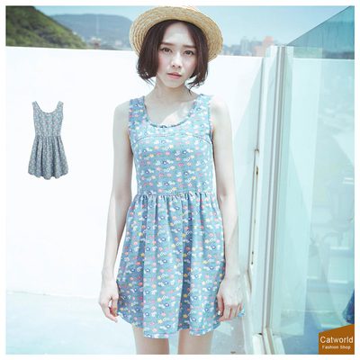 牛仔彩色小花背心洋裝中藍色 Catworld