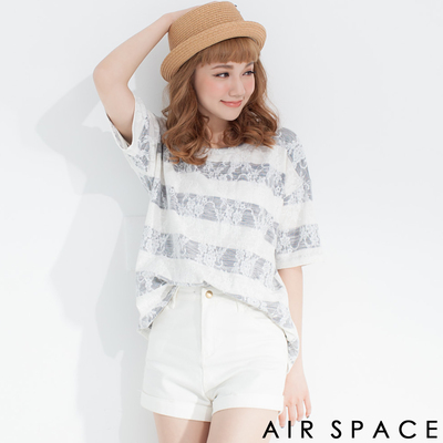 AIR SPACE 蕾絲條紋棉質短袖上衣(個性黑)